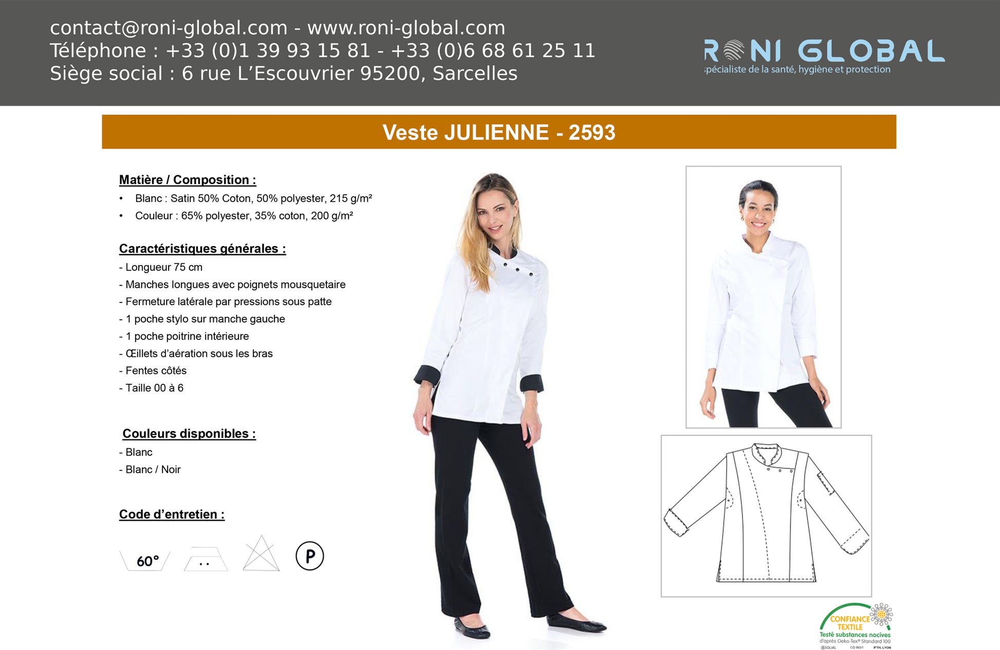 Veste de cuisine blanche femme manches longues en coton/polyester 2 poches - JULIENNE REMI CONFECTION