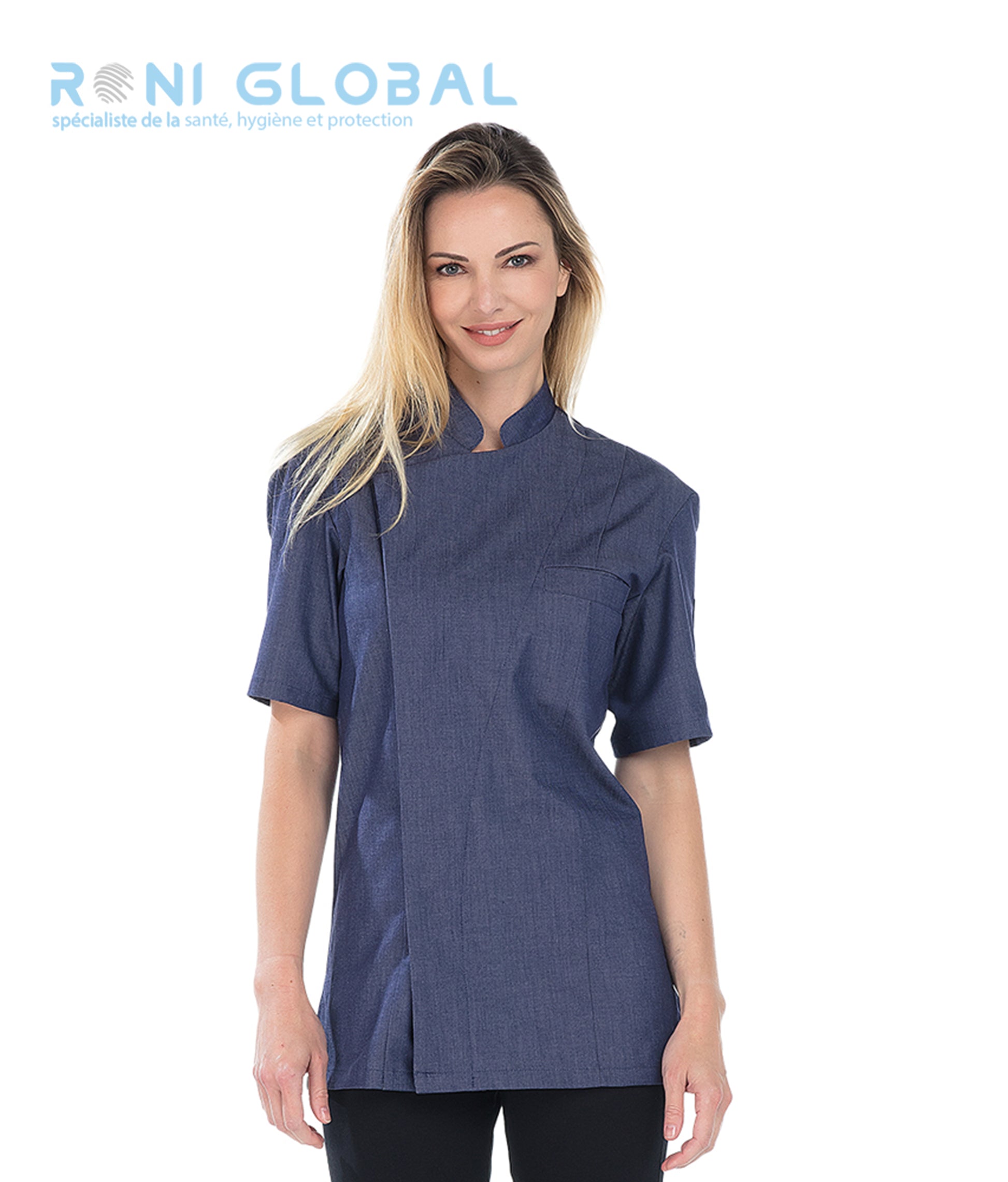 Veste de cuisine manches courtes, fermeture latérale par pressions sous patte, 1 poche poitrine intérieure, 1 poche poitrine passepoilée, 1 poche stylo sur manche gauche, longueur 75cm.