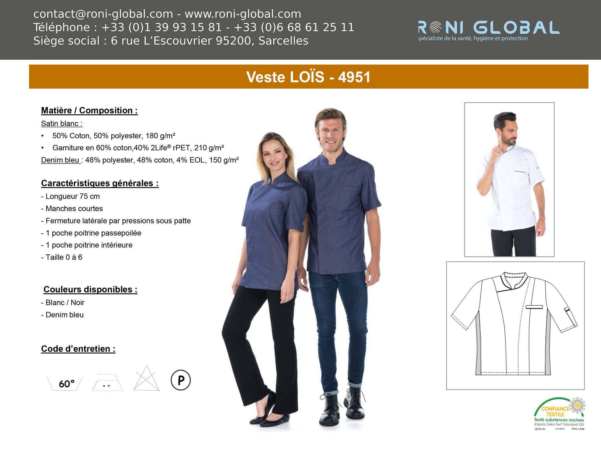 Veste de cuisine unisexe manches courtes 3 poches - LOIS REMI CONFECTION