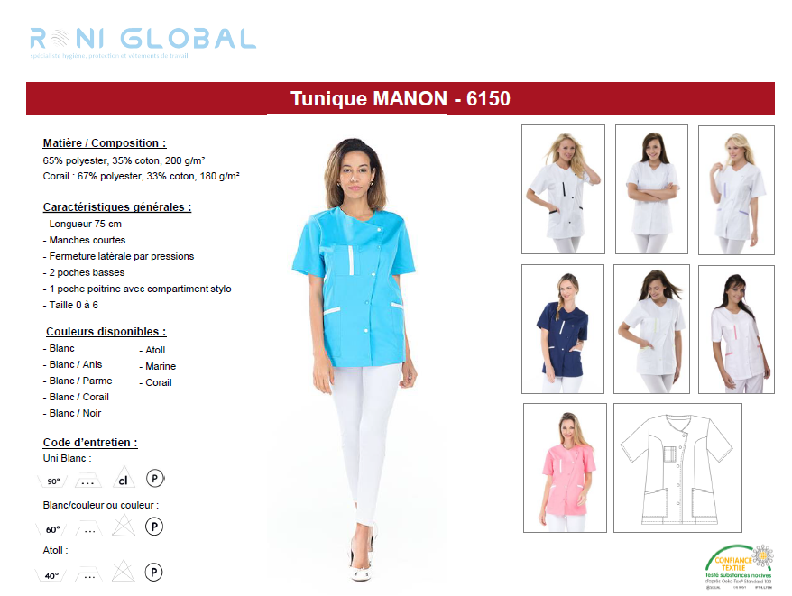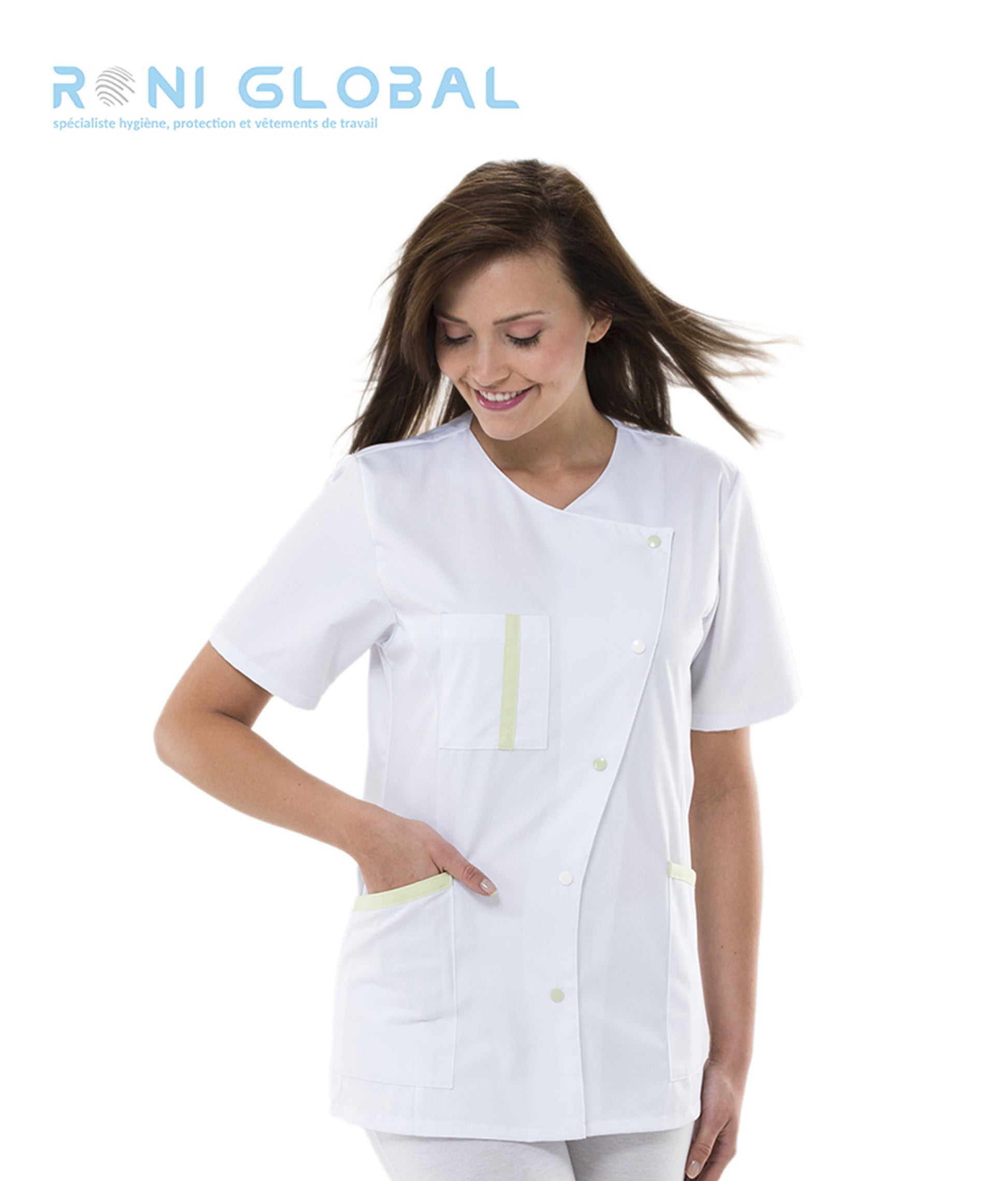 Tunique manches courtes, 3 poches avec une poche stylo dans la poche poitrine, fermeture latérale par pressions, longueur 75 cm.