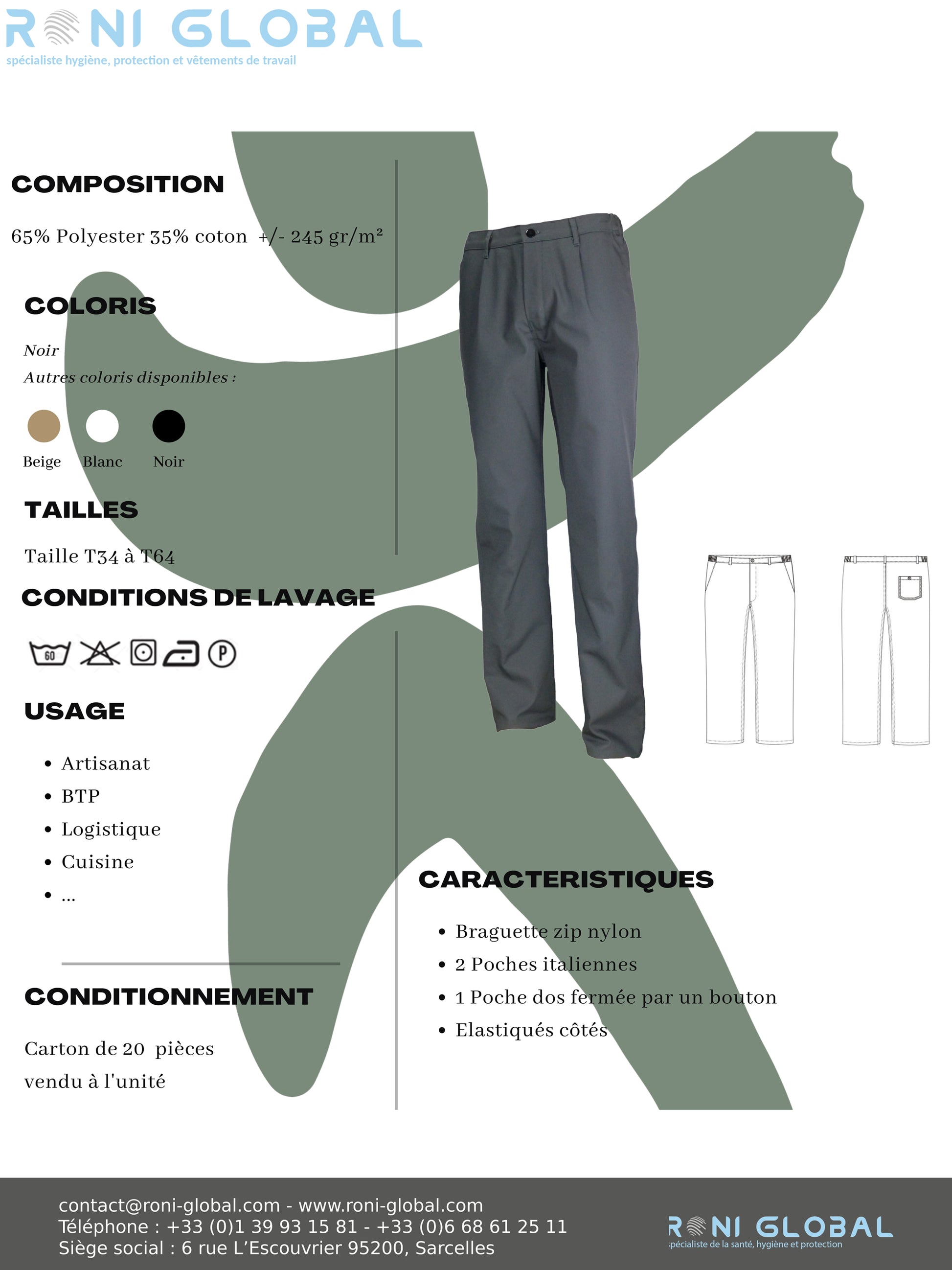 Pantalon de travail homme gris en coton/polyester - PANTALON PC GRIS ELASTIQUE PBV