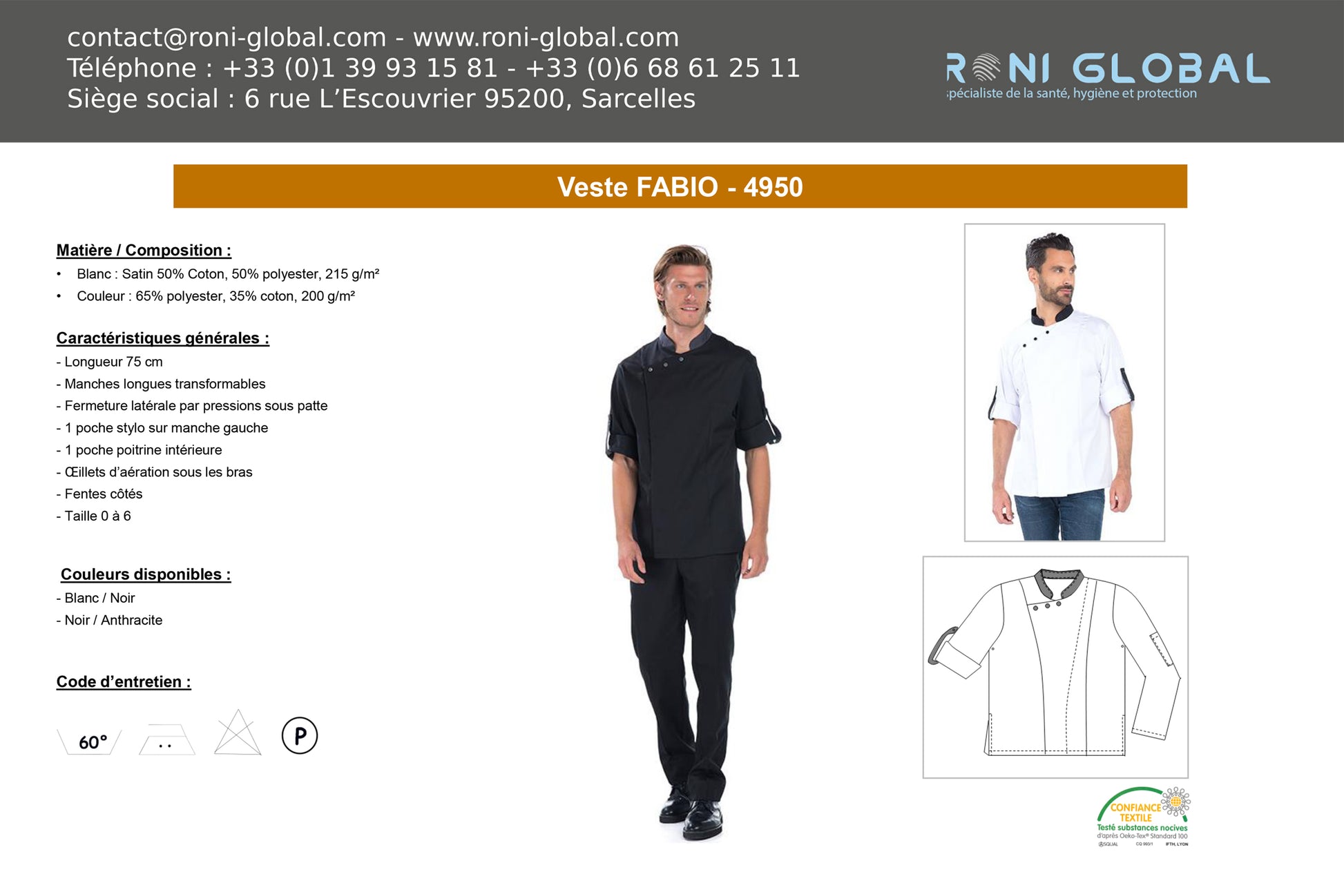 Veste de cuisine homme manches longues transformables en coton/polyester 2 poches - FABIO REMI CONFECTION