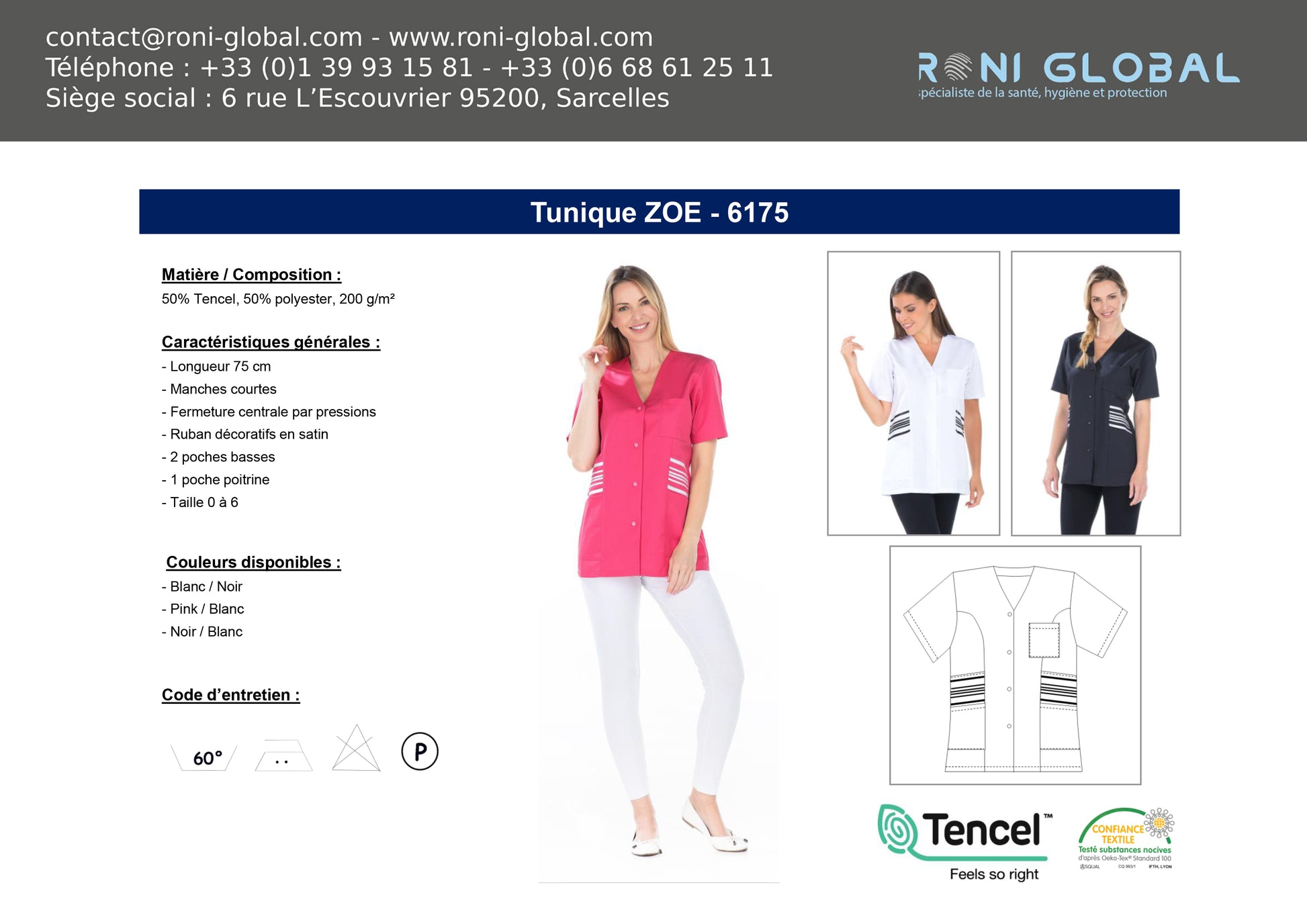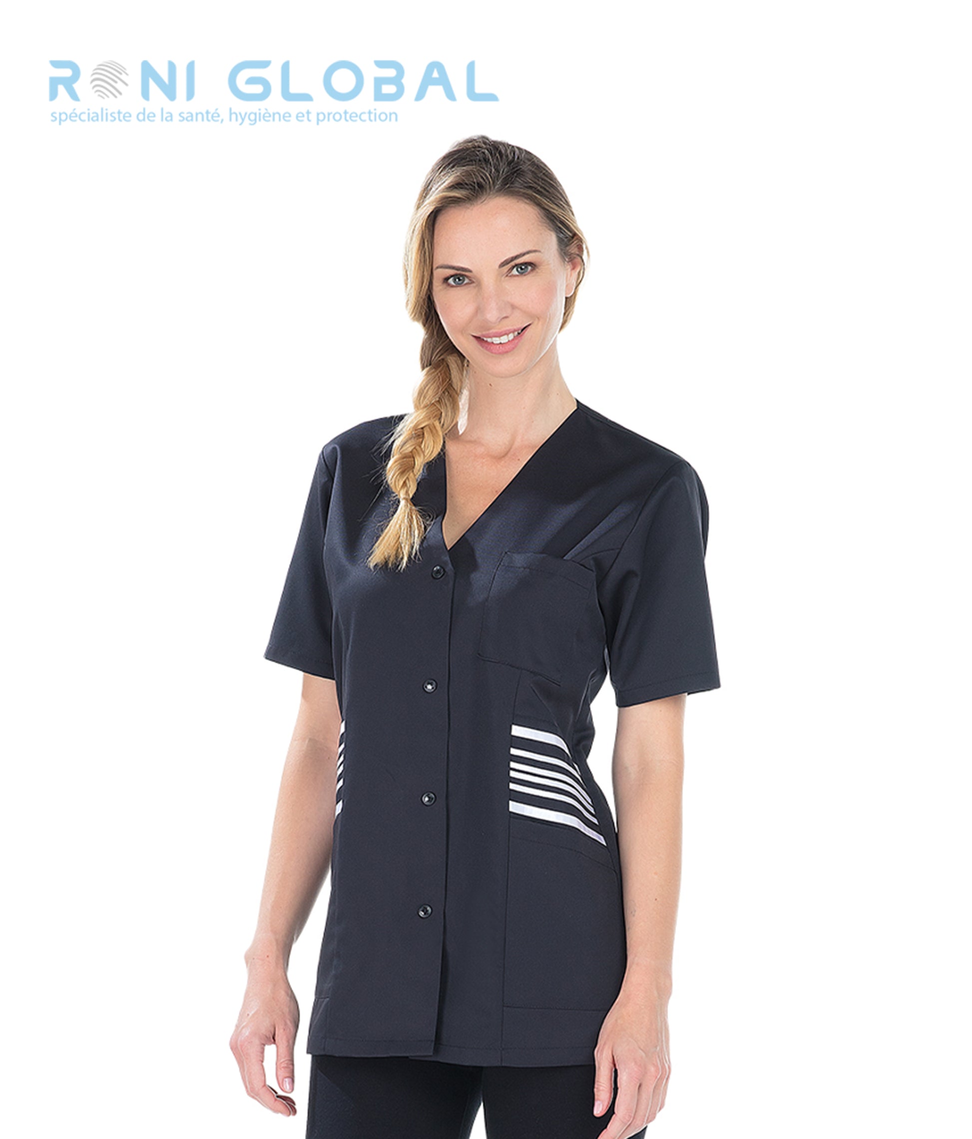 Tunique de travail noire femme manches courtes en polyester/tencel 3 poches - ZOE REMI CONFECTION